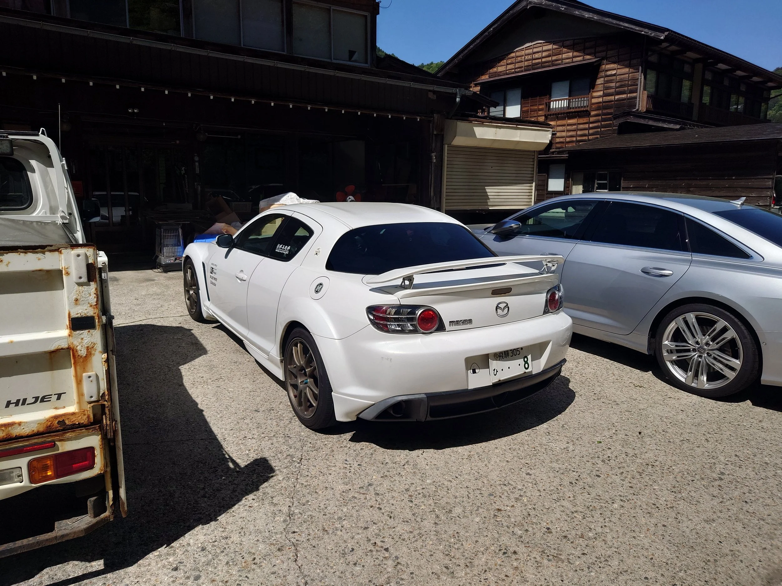 Mazda RX-8 avvistata a Shirakawa, l’ultimo dei pochi e rari modelli spinti da un motore Wankel rotativo. Non è raro imbattersi in auto elaborate, rare e icone per gli appassionati delle quattroruote. Foto di Walk of Japan