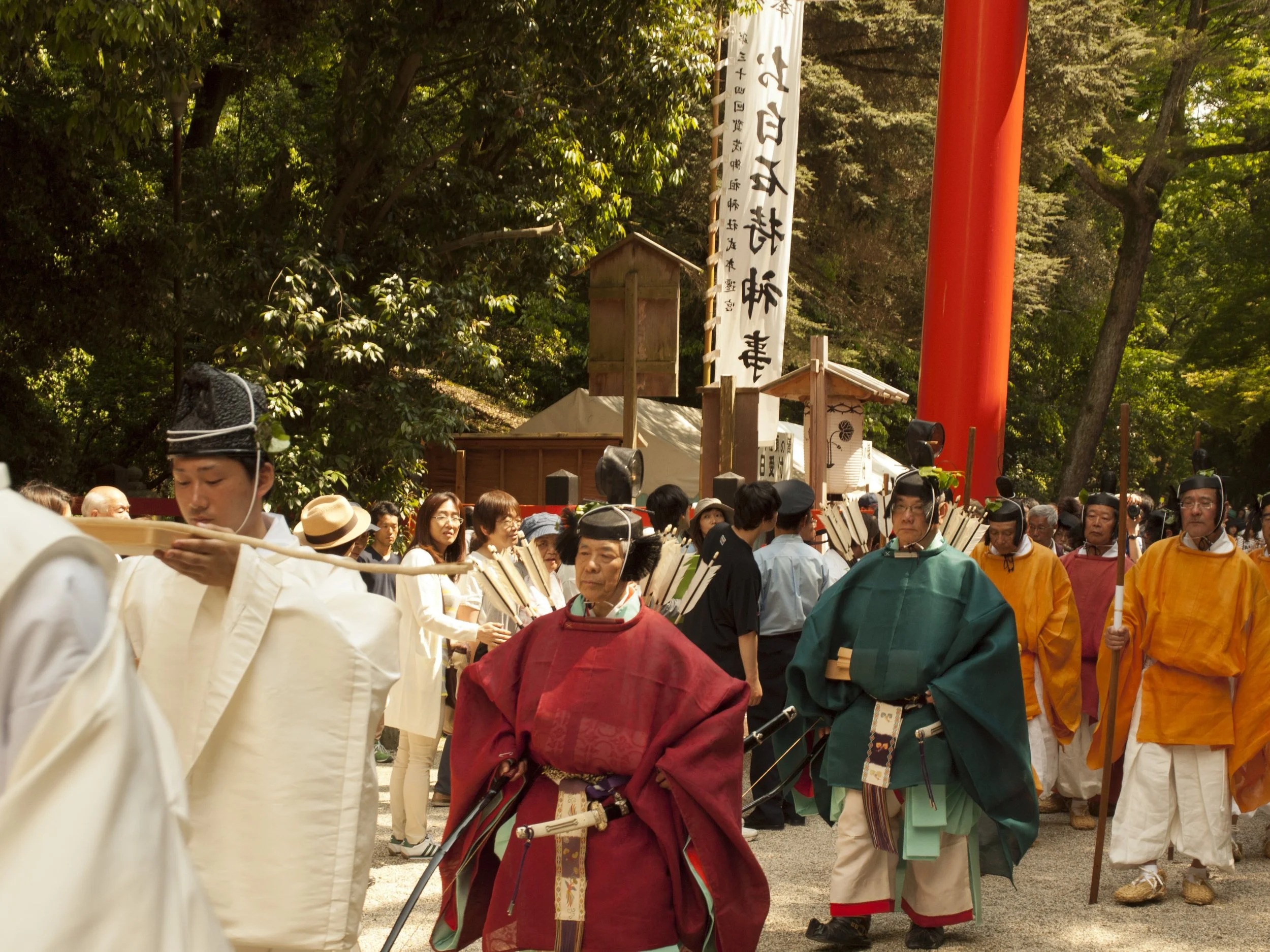 La processione, che coinvolge circa 500 partecipanti vestiti con sontuosi costumi nobiliari d'epoca, offre uno spettacolo raro e suggestivo, come se il tempo fosse tornato indietro di più di mille anni. I costumi, sfarzosi e fedeli all'estetica Heian, ricordano la magnificenza delle antiche corti imperiali. Lungo il percorso, i visitatori possono godere delle bellezze storiche della città, come il Palazzo Imperiale, i giardini di Kyoto, il fiume Kamo e i tranquilli santuari scintoisti immersi nella natura.